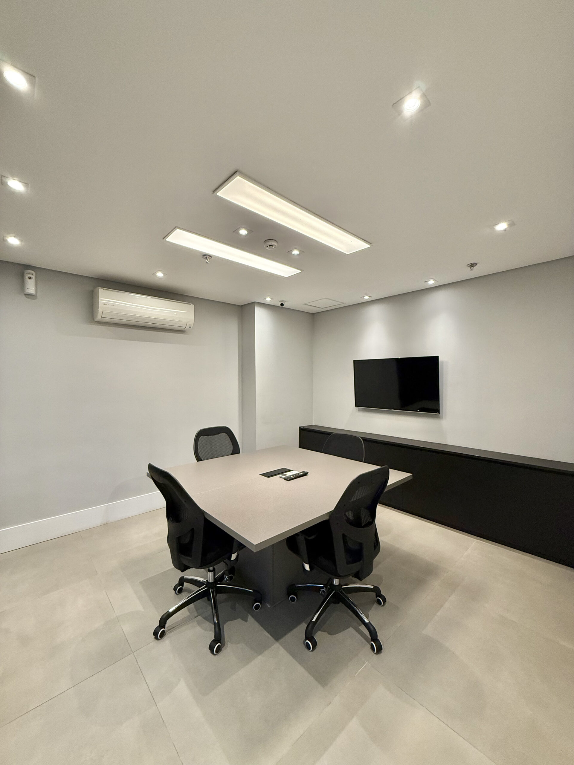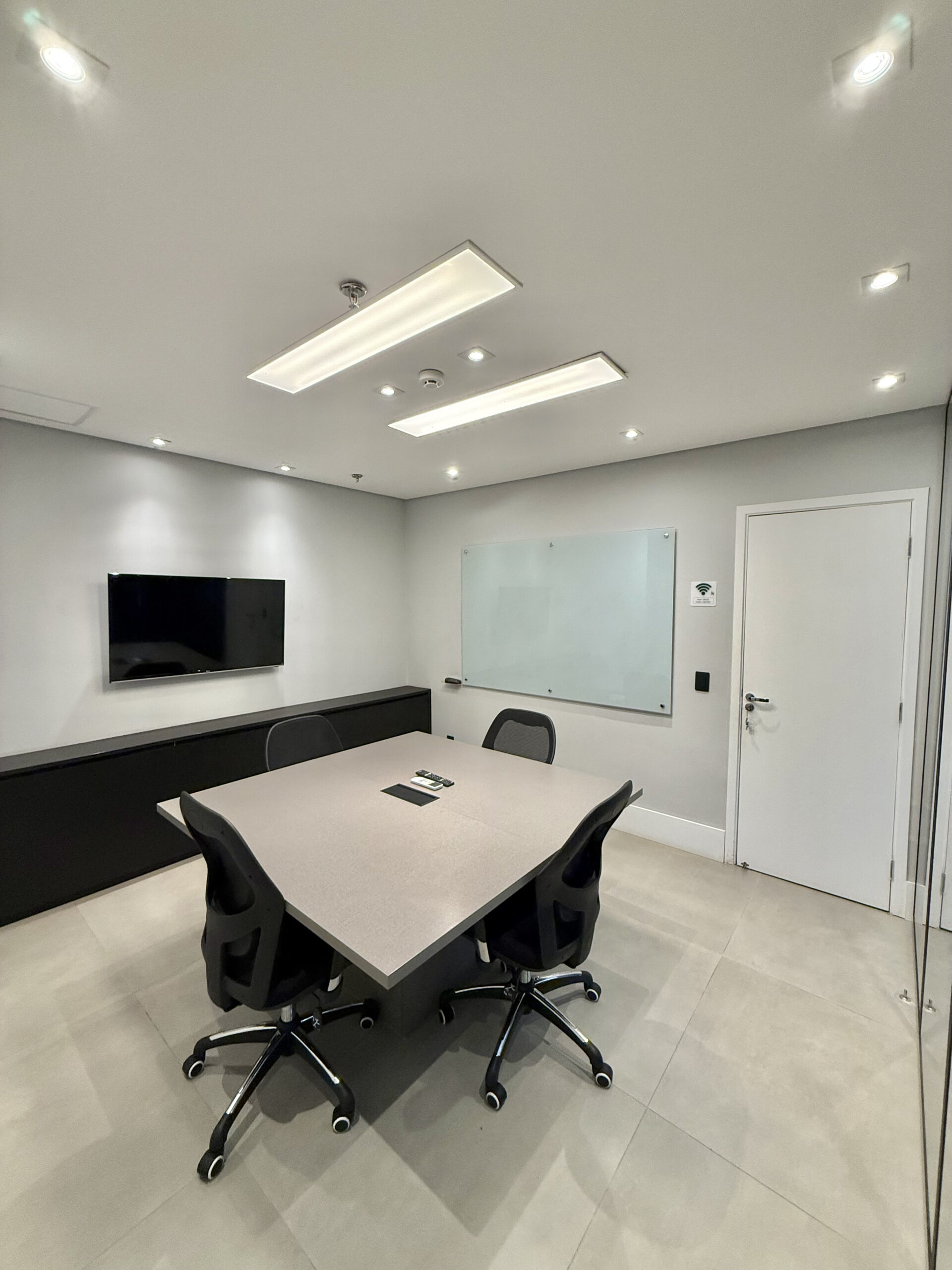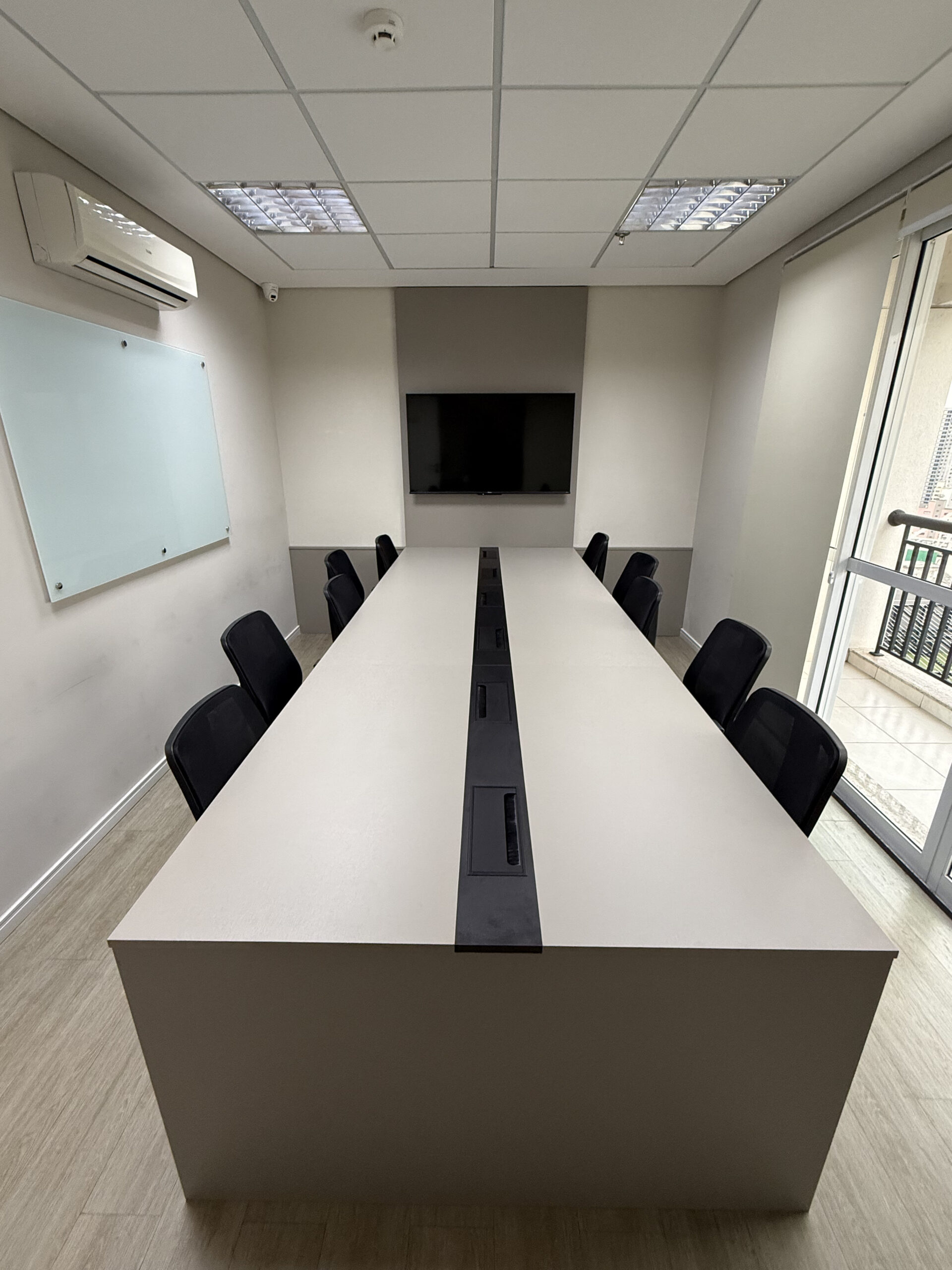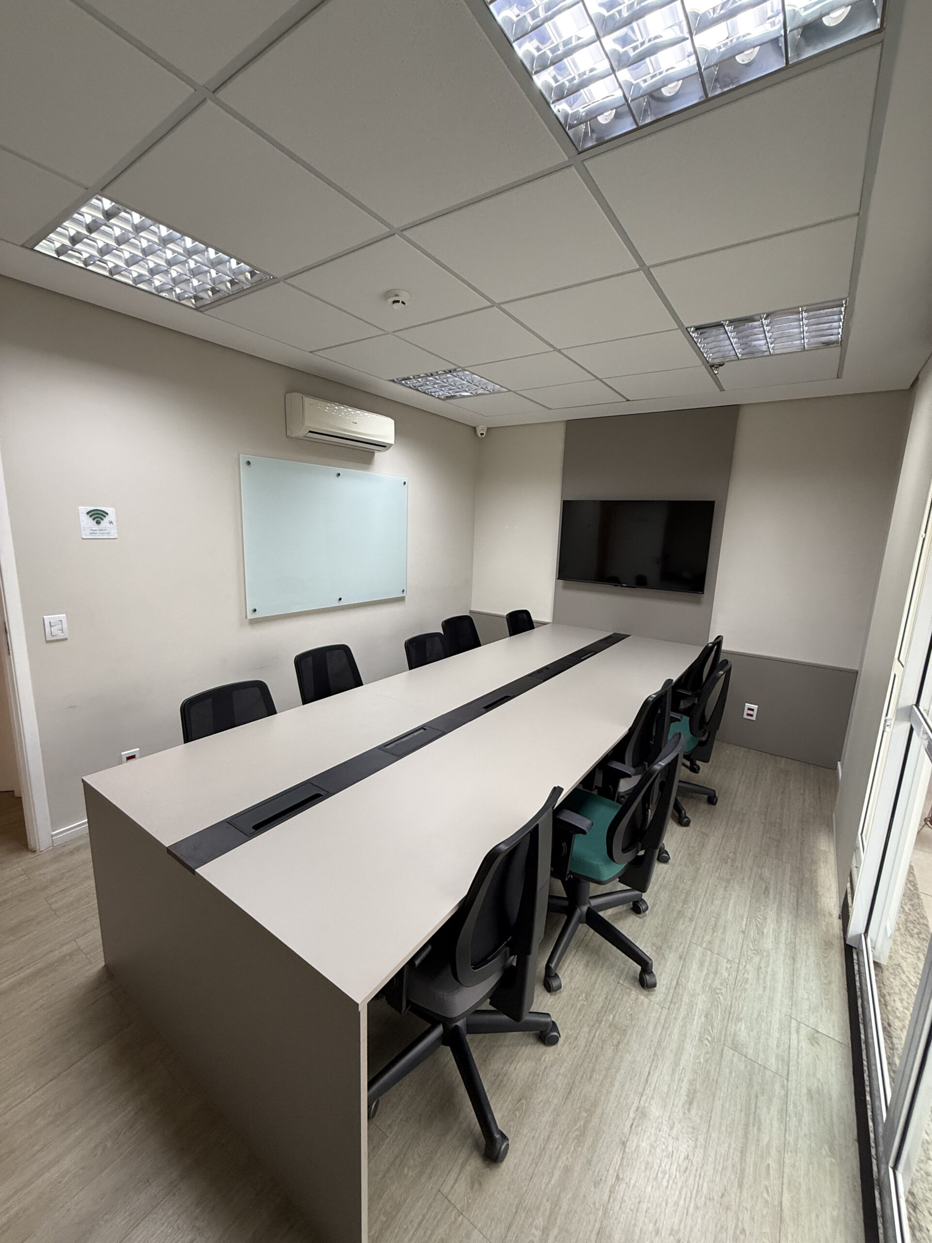 Lousa de vidro, TV 32, cabo HDMI, telefone VOIP, ar condicionado, café, água, limpeza, internet banda larga .