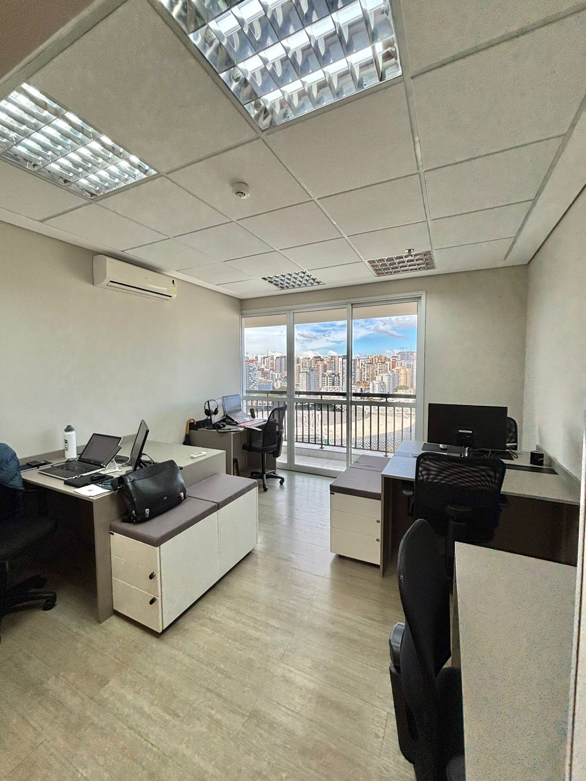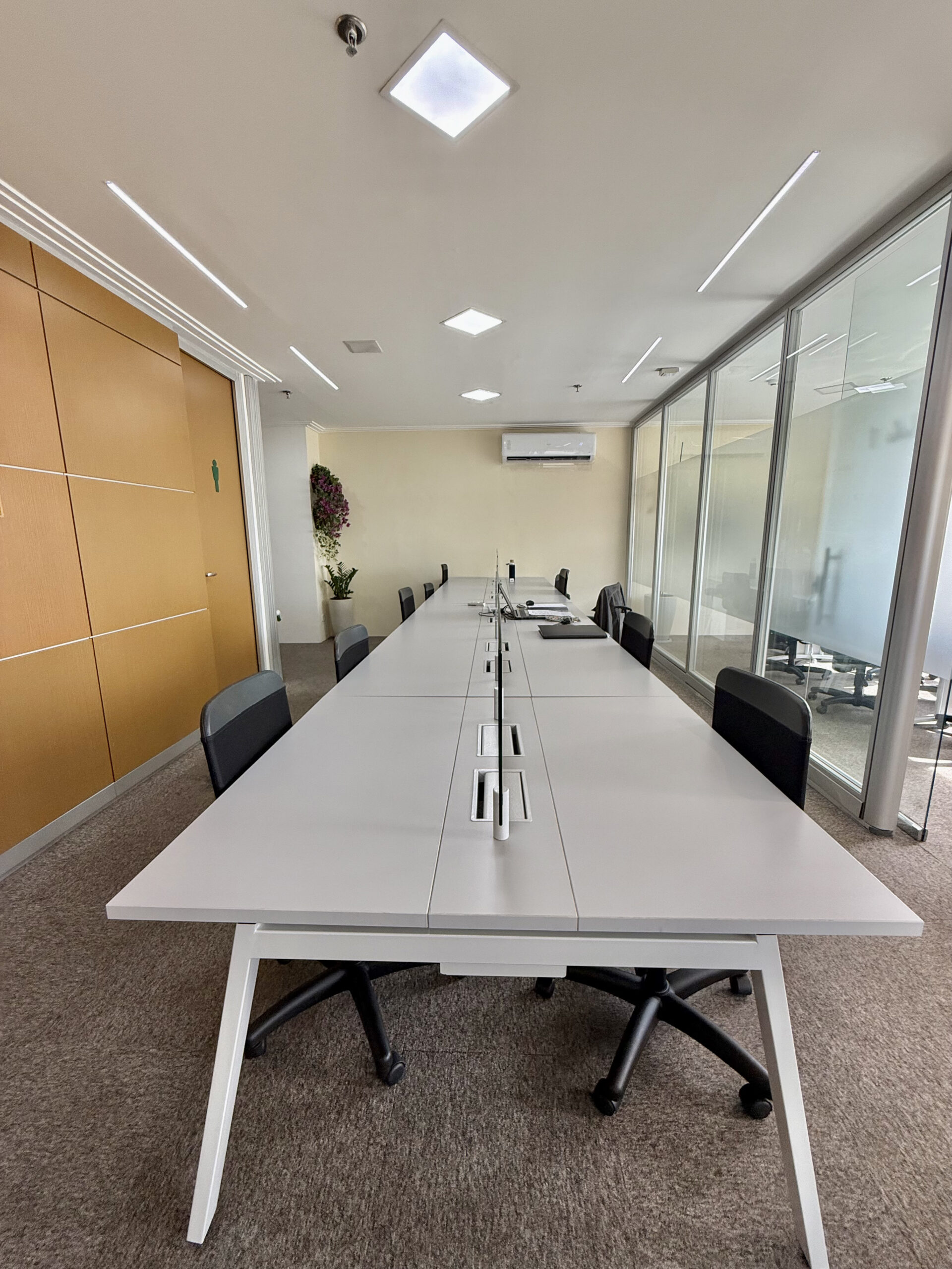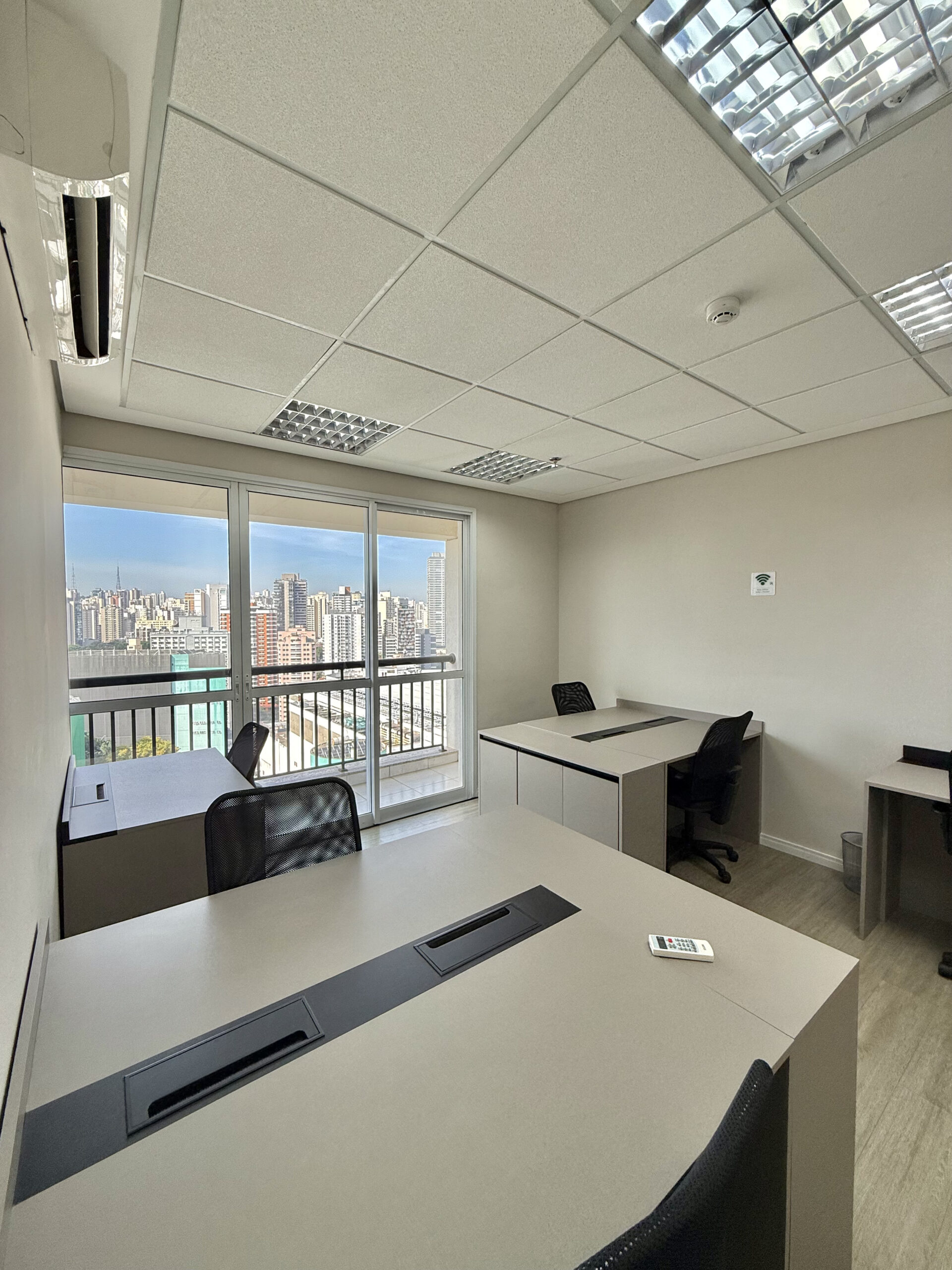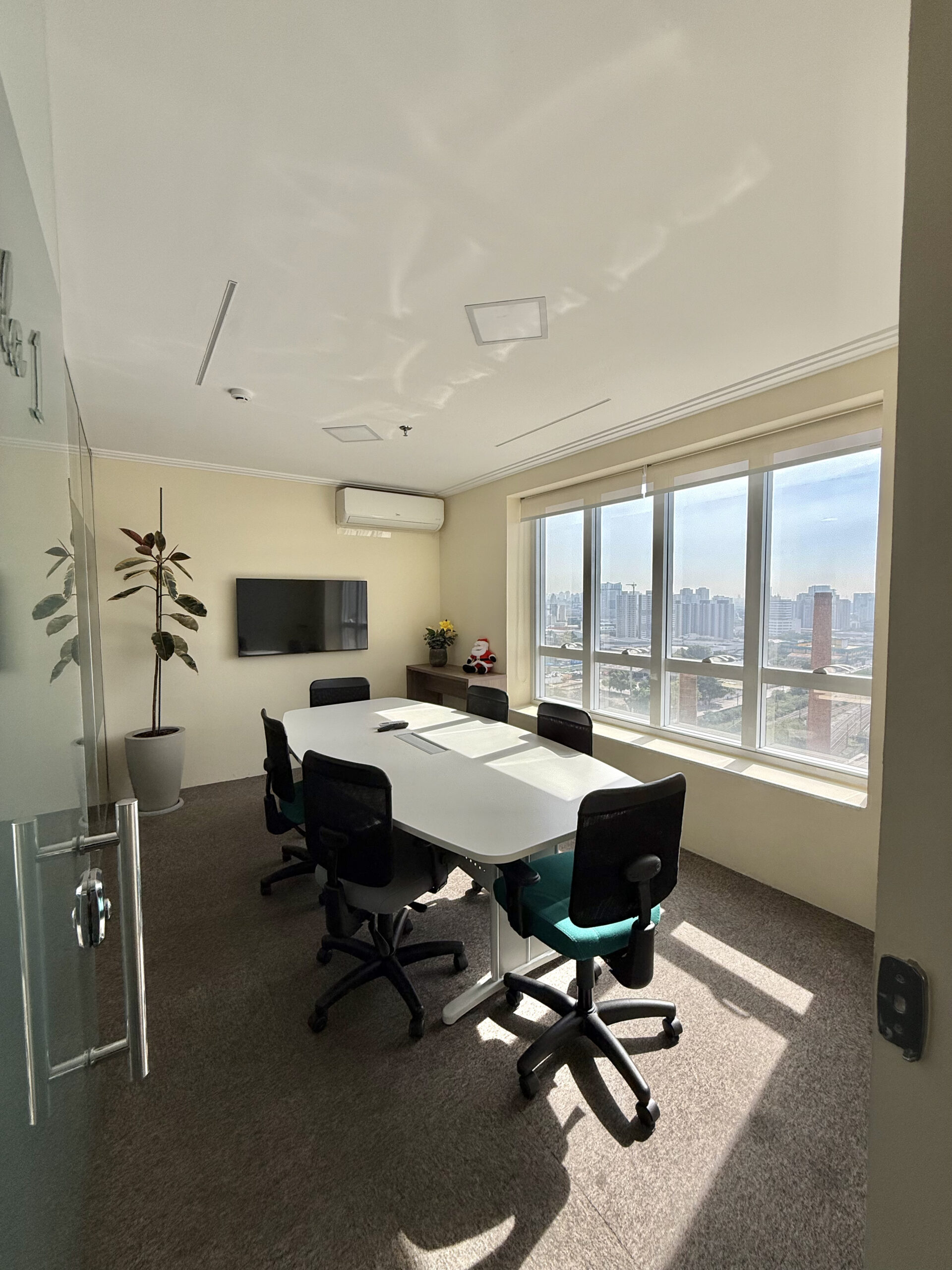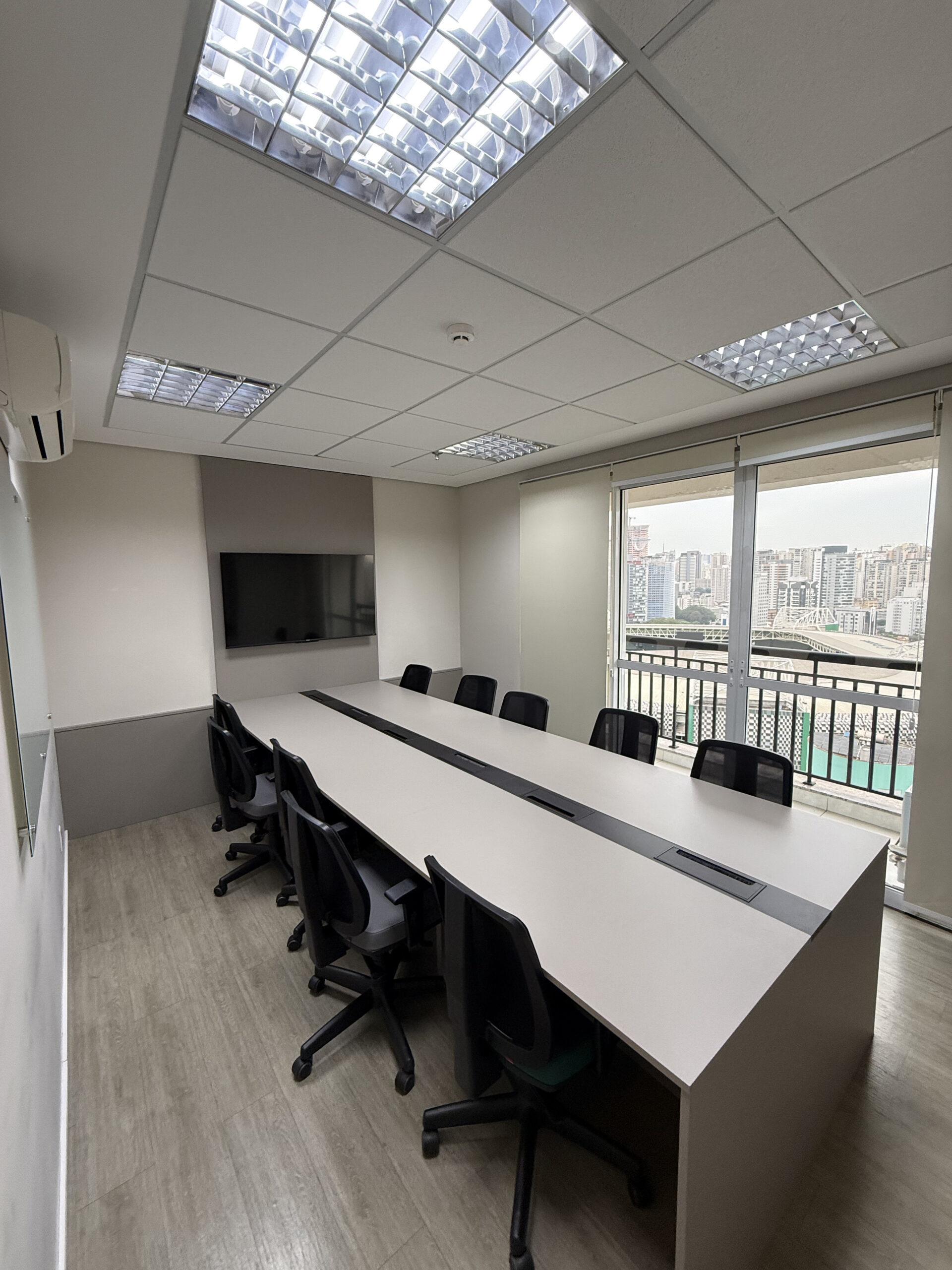 Lousa de vidro, TV 32, cabo HDMI, telefone VOIP, ar condicionado, café, água, limpeza, internet banda larga .